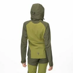 - Kombinasjon av to forskjellige softshellmaterialer med 4-veis stretch. Vind- og vannavvisende softshellmateriale med PFAS-fri impregnering på utsatte områder, og et lettere materiale i ryggen og under ermene hvor det er behov for bedre pusteevne.