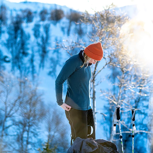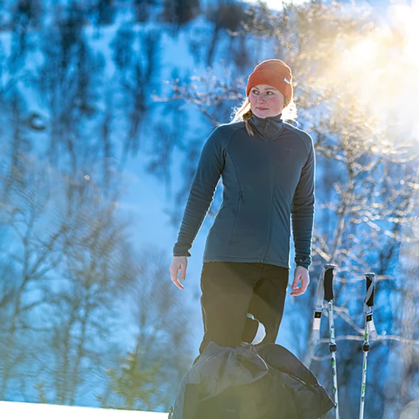 - Strikket materiale med merinoull på utsiden og 100 % resirkulert polyester på innsiden. Perfekt kombinasjon mellom isolerende og fukttransporterende egenskaper.