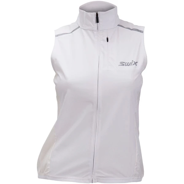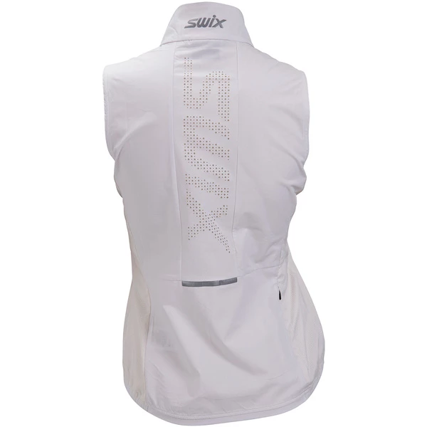 Hovedstoffet i vesten er vindavvisende, men puster like fullt svært godt. I tillegg er ventileringen optimalisert med perforerte paneler på sidene og laserkuttede hull i form av Swix logo på ryggen. Det finnes en praktisk mindre lomme på brystet, samt en større lomme bak i korsryggen, begge med et pustende meshmateriale på innsiden. Vesten har refleksbånd på skuldrene, på ryggen samt en reflektiv Swix logo på brystet og bak på kragen.